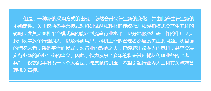 單位沒有自己出資搭建平臺,而是使用已經(jīng)存在的商業(yè)化采購平臺,所有權(quán)也不屬于單位,服務(wù)器也沒有在本單位,同時與其它多家單位共享平臺的使用。這種模式,我們稱之為第三方商城平臺。 這樣的平臺開始只在中科院系統(tǒng)出現(xiàn),現(xiàn)在已經(jīng)開始在其它大學(xué)里采用。