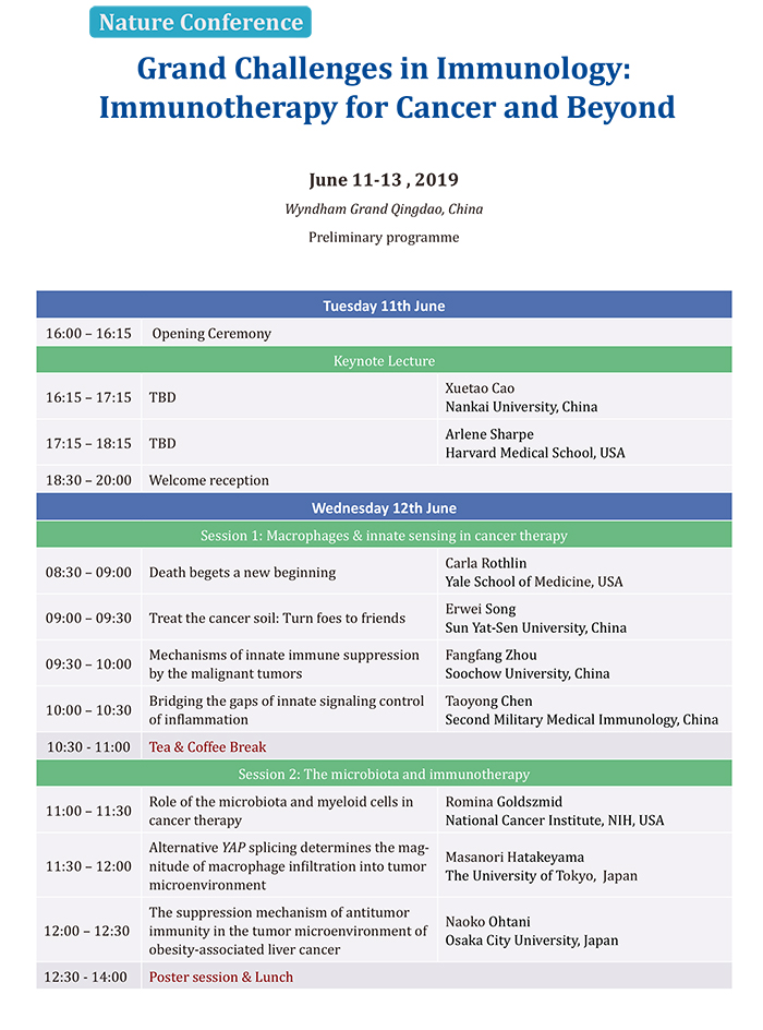 此會(huì)議是以《Nature Immunology》、《Nature Review Immunology》、《Nature》和《Cellular &Molecular Immunology》四本國(guó)際頂級(jí)免疫學(xué)期刊為交流平臺(tái),以促進(jìn)國(guó)際免疫學(xué)家交流為主旨的學(xué)術(shù)會(huì)議,自2009年起本系列會(huì)議啟動(dòng)召開,現(xiàn)已成功舉辦六屆會(huì)議。