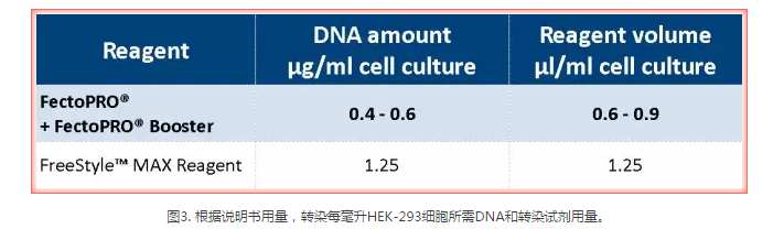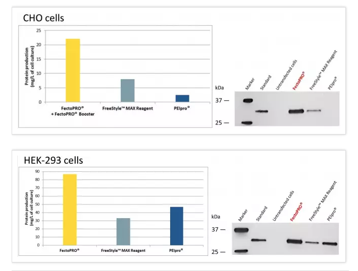圖2. FectoPRO?大幅提高懸浮CHO和HEK-293細胞的蛋白產量。按1×106個細胞/ml的密度將FreeStyle? CHO-S和HEK-293F細胞培育在30 ml的無血清培養(yǎng)基中,并依照每種試劑說明書推薦用量FectoPRO?+FectoPRO?輔助藥劑Booster (0.4 μg DNA/ml)、FreeStyle?MAX試劑(1.25 μg DNA/ml)或PEIpro?(1 μg DNA/ml)進行轉染。用蛋白質G親和性定量法(HPLC)和Western Blot檢測轉染后72小時(CHO細胞)和120小時(HEK-293細胞)的IgG3-Fc (34 kDa)的產量。