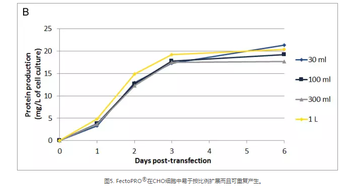 過去幾年,蛋白質生產的持續(xù)時間有所增加,大部分蛋白質生產過程持續(xù)1~2周,以獲得最佳的蛋白產量。FectoPRO?確保幾天內產生持續(xù)的蛋白產量,同時保持較高的細胞活力以延長蛋白生產。
