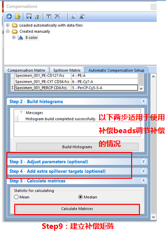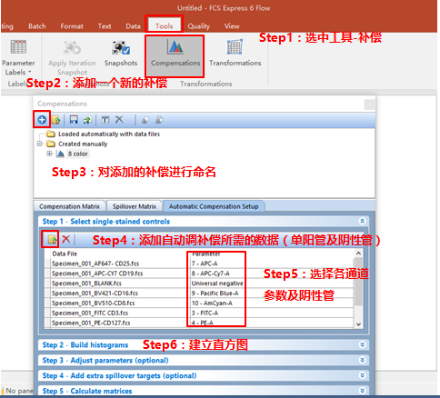 依次調(diào)整好各單管Control的Marker門的位置。此處不一一列舉?;氐窖a(bǔ)償界面。此處的3、4適用于使用補(bǔ)償beads調(diào)節(jié)補(bǔ)償?shù)那闆r(由于本次數(shù)據(jù)為細(xì)胞,此處不詳細(xì)列出,如對(duì)此步驟感興趣,可咨詢小達(dá)君)