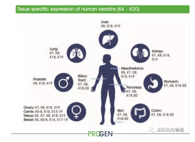 Progen可提供130多種Keratins抗體以及標準品, 抗體包括單抗、多抗,可用于IHC/WB多種應用。