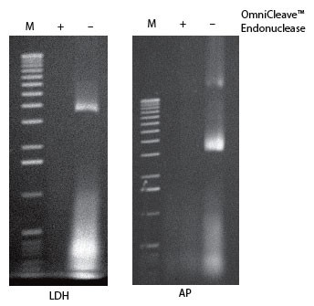 來自于大腸桿菌表達的LDH和AP的細胞裂解樣品用OmniCleave? Endonuclease處理或不加核酸酶處理。各取2 μl細胞裂解液進行1%瓊脂糖電泳,核酸EB染色;泳道M,1 kb ladder。