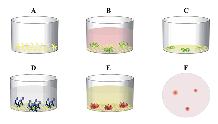 加入顯色底物,在酶的催化分解下,生成不可溶的色素,沉淀在膜上,即形成斑點(diǎn);斑點(diǎn)計(jì)數(shù),結(jié)果分析。