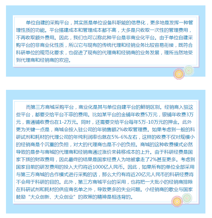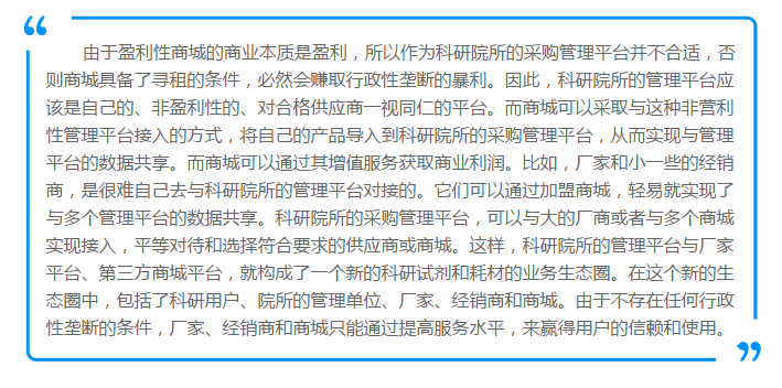 單位沒有自己出資搭建平臺,而是使用已經(jīng)存在的商業(yè)化采購平臺,所有權(quán)也不屬于單位,服務(wù)器也沒有在本單位,同時與其它多家單位共享平臺的使用。這種模式,我們稱之為第三方商城平臺。 這樣的平臺開始只在中科院系統(tǒng)出現(xiàn),現(xiàn)在已經(jīng)開始在其它大學(xué)里采用。