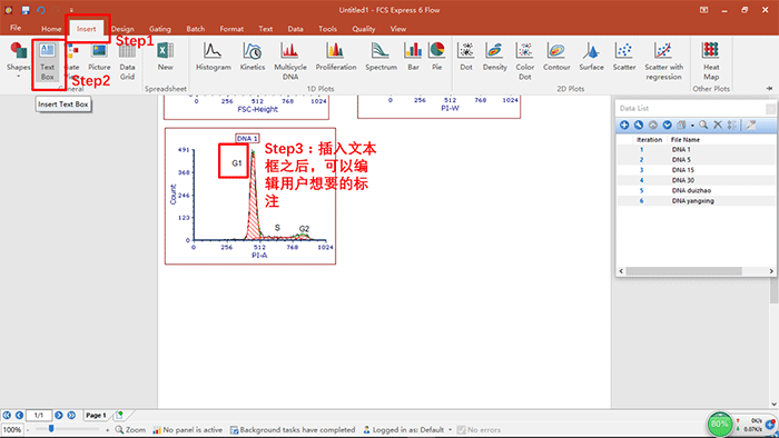 b.將細(xì)胞周期分析的模板調(diào)出來之后,點(diǎn)擊OK,會彈出如下圖所示的界面,然后可以利用insert按鈕,插入文本框,從而可實(shí)現(xiàn)圖注的編輯,如下圖所示(我們可以對圖中的每個(gè)峰進(jìn)行命名,從而可以對細(xì)胞周期中的各個(gè)時(shí)期進(jìn)行命名和解釋):