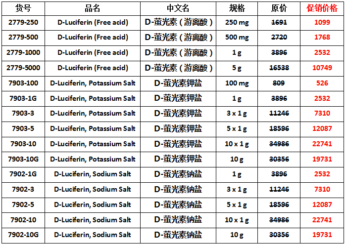 英文名:D-Luciferin (Free acid) 、D-Luciferin(Potassium Salt)、D-Luciferin( Sodium Salt)
