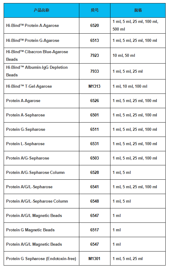 BioVision公司生產(chǎn)的 Hi-BindTM T-Gel Agarose beads 是T-gel 瓊脂糖凝膠法,具有很高的蛋白結合能力,可達30mg蛋白/ml beads。同時,可兼容多種樣本,任何類型的免疫球蛋白都可純化,如來自血清、腹水、組織或細胞培養(yǎng)液等樣本中的IgG, IgE, IgM, IgA, IgY 和Fab 片段等。