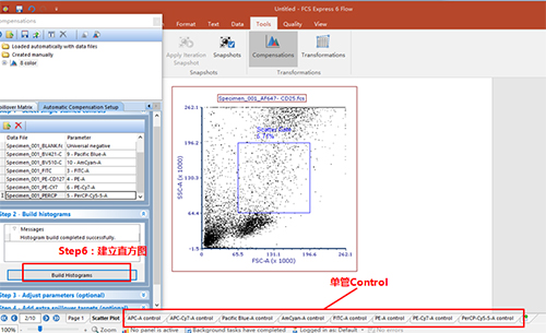 依次調(diào)整好各單管Control的Marker門的位置。此處不一一列舉?;氐窖a(bǔ)償界面。此處的3、4適用于使用補(bǔ)償beads調(diào)節(jié)補(bǔ)償?shù)那闆r(由于本次數(shù)據(jù)為細(xì)胞,此處不詳細(xì)列出,如對(duì)此步驟感興趣,可咨詢小達(dá)君)
