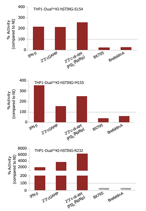 功能獲得(Gain-of-function)的活化-THP1-Dual? KI-hSTING-S154細胞和THP1-Dual? KI-hSTING-M155細胞均均可以持續(xù)活化ISG,而THP-1-Dual? KI-hSTING-R232卻不能。加入IFN-β或STING激動劑將進一步促進ISG的活化。注意,結(jié)果已被非刺激細胞背景信號標準化。因為其持續(xù)活化STING的特性,SAVI細胞的背景非常高,誘導(dǎo)ISG應(yīng)答的增加倍數(shù)低于R232對照細胞。