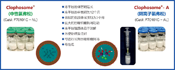 為了延長(zhǎng)脂質(zhì)體的保質(zhì)期,廠家已成功推出凍干粉狀的Clophosome?產(chǎn)品,其質(zhì)保期已延長(zhǎng)至12個(gè)月。通過簡(jiǎn)單的溶解,即可成功獲得氯磷酸鹽脂質(zhì)體。同樣,凍干粉狀的Clophosome?保持了與液態(tài)Clophosome?同樣杰出的巨噬細(xì)胞耗竭功能,以及活性高,使用方便,無菌無毒,以及高濃度,高包封率,不粘稠,無沉淀,易于注射等諸多優(yōu)越性能,尤其是凍干粉狀的Clophosome?克服了脂質(zhì)體保質(zhì)期短,穩(wěn)定性差的缺陷。