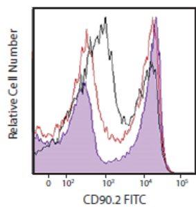 (將小鼠脾臟細胞分別用TruStainFcX TM PLUS(0.25μg/test,紫色填充直方圖),TruStainFcX TM(克隆93,1μg/test,紅線)封閉之后用CD90.2FITC染色,與未處理的小鼠脾臟細胞(黑線)作比較。結(jié)果顯示TruStainFcXTM PLUS封閉效果更優(yōu)。)