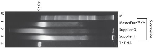1%瓊脂糖膠電泳分析不同試劑盒提取純化啤酒酵母的500ng DNA,使用EB進行染色。用MasterPure? Kit分離的DNA的大小絕大多數(shù)在40-50 kb范圍內(nèi)。用其它試劑盒提取的DNA會降解成更小的片段。