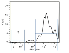補(bǔ)償調(diào)節(jié)抗體的正確選擇對(duì)于熒光通道之間的補(bǔ)償調(diào)節(jié)是非常重要的。要求選擇的抗體所結(jié)合的抗原分子在樣本細(xì)胞中有明確表達(dá),占樣品細(xì)胞的10%以上,50%以下。如果陽性細(xì)胞比例太低,在陽性細(xì)胞區(qū)域無法形成明顯的細(xì)胞團(tuán),無法判斷調(diào)節(jié)是否合適。如陽性細(xì)胞比例過高,則不表達(dá)該抗原的陰性細(xì)胞無法形成明顯的細(xì)胞團(tuán),如圖1-4直方圖所示。