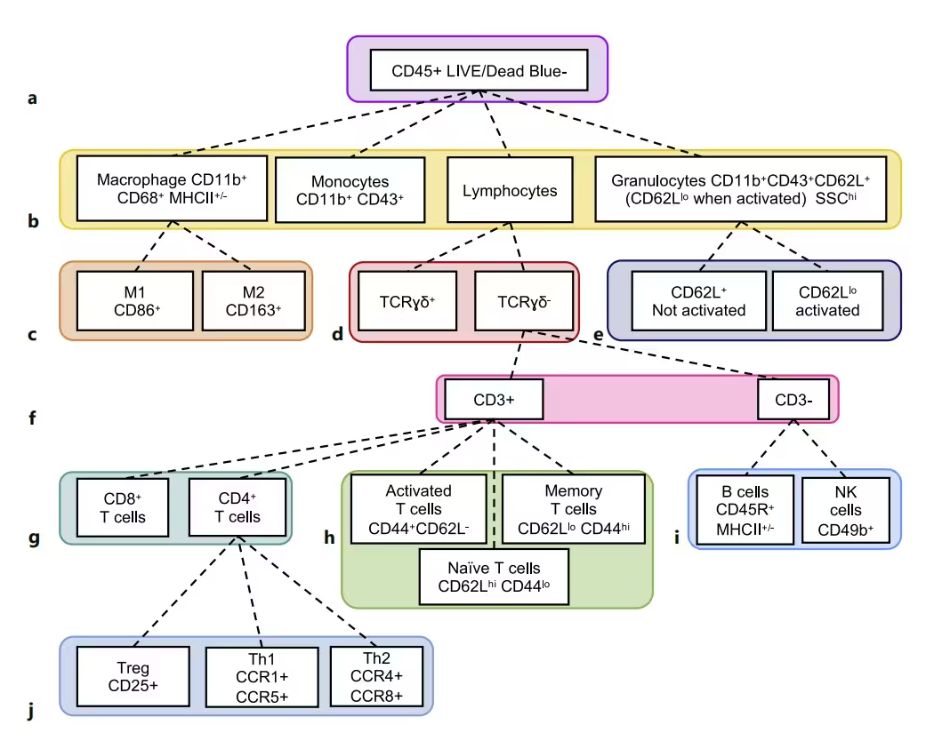 大鼠模型是生物醫(yī)學(xué)研究中重要的資源,與人類(lèi)免疫系統(tǒng)相似,而常被用于免疫相關(guān)功能研究。然而目前小鼠模型在基礎(chǔ)和機(jī)制免疫學(xué)研究中占主導(dǎo)地位,相對(duì)缺乏對(duì)大鼠模型中免疫細(xì)胞的流式分析鑒定。本文將分享對(duì)大鼠常見(jiàn)免疫細(xì)胞流式鑒定方案,鑒定分析不同組織中的粒細(xì)胞、巨噬細(xì)胞、T細(xì)胞、B細(xì)胞及NK細(xì)胞。
