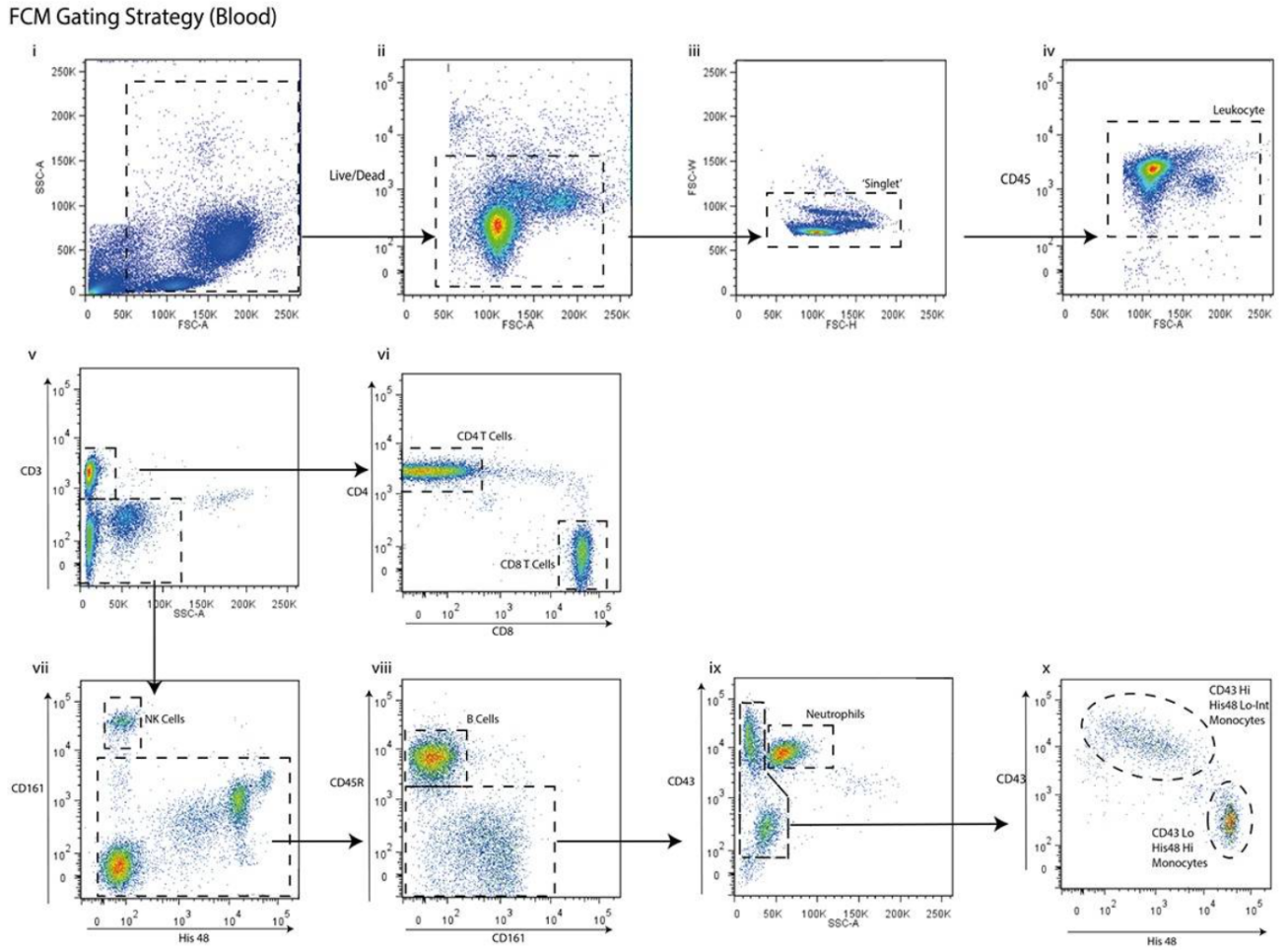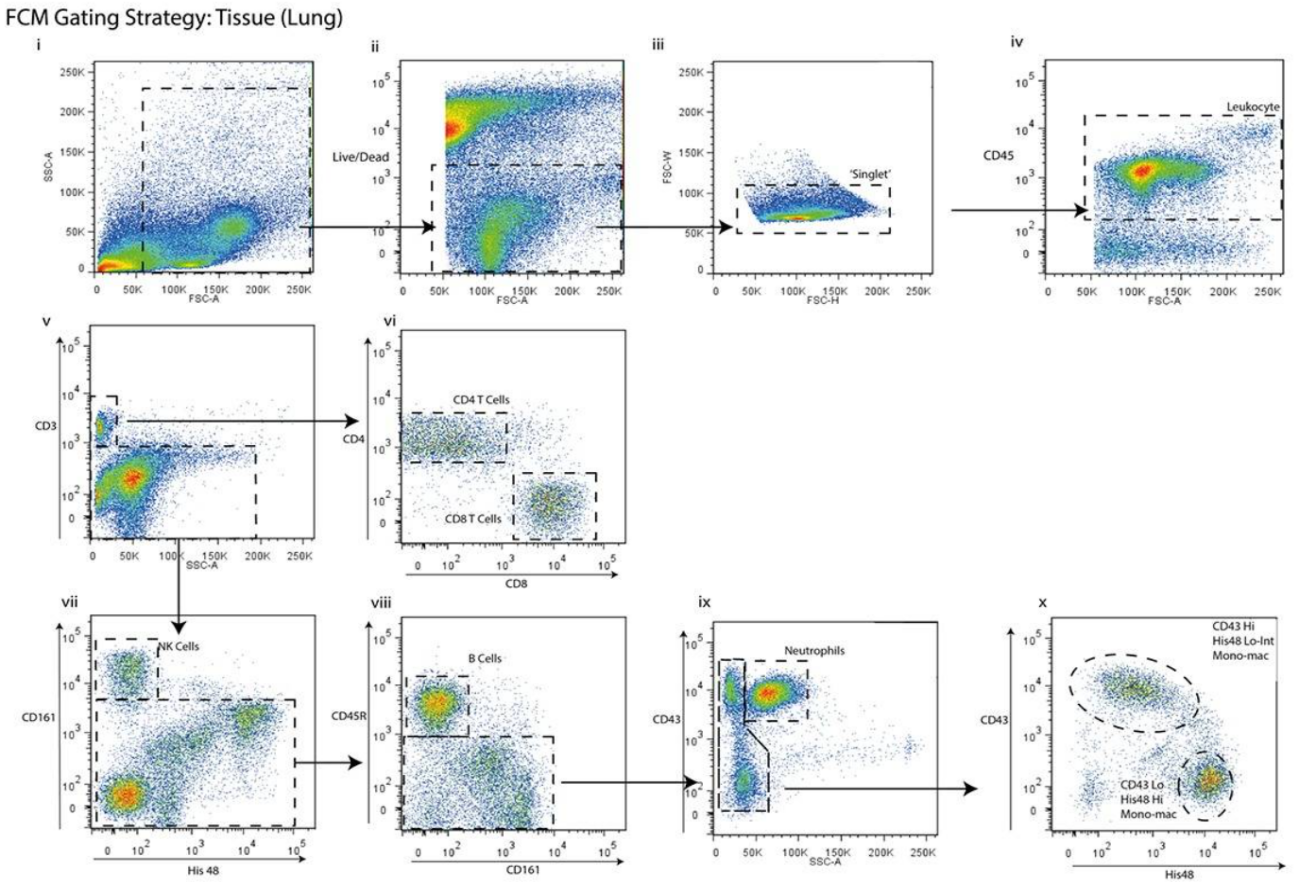 5. 中性粒細(xì)胞:從CD45+CD3-CD161-CD45R-的細(xì)胞中,圈出CD43+細(xì)胞(ix);
