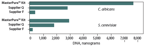 分別提取S.cerevisiaeC. albicans.中的DNA,用熒光染料33258對DNA進(jìn)行定量分析(RNA對該定量幾乎沒有影響)。圖中顯示的是兩次實(shí)驗(yàn)的平均DNA得率 。MasterPure Kit對C.albicans的提取量相比其它試劑盒高17倍;對S. cerevisiae的提取量相比其它試劑盒高12倍。