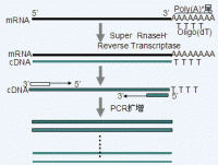 • 隨機(jī)引物:某些特定mRNA由于含有使反轉(zhuǎn)錄酶終止的序列,比較難以轉(zhuǎn)錄成全長(zhǎng)序列時(shí),可采用非特異的隨機(jī)引物來轉(zhuǎn)錄全長(zhǎng)mRNA。選擇這種引物,體系中所有RNA分子會(huì)全部充當(dāng)DNA第一鏈模板,然后PCR引物在下游擴(kuò)增過程中再擴(kuò)增特異的目的基因。通常,用此引物合成的cDNA中,96%來源于rRNA。
